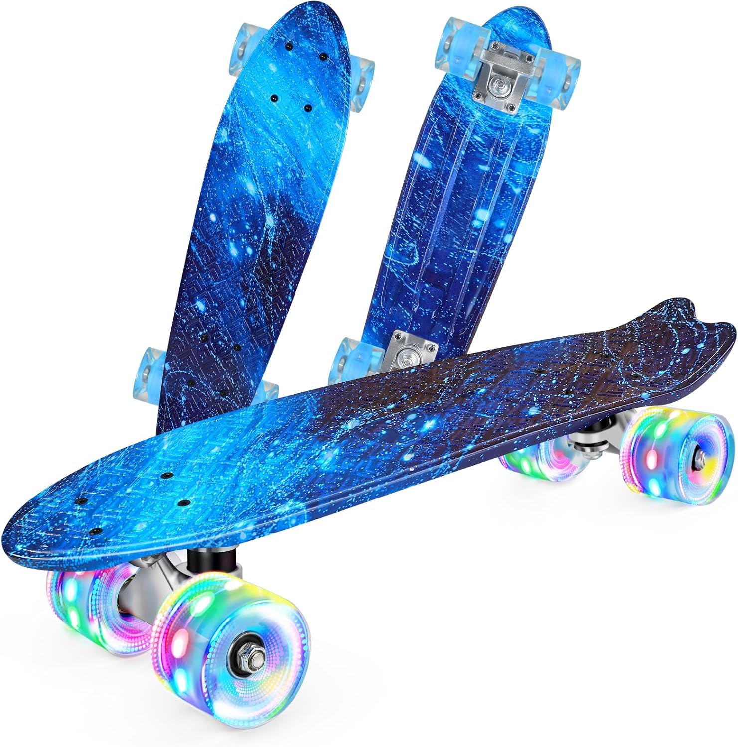 • Smooth and Speedy Ride: The 22 inch skateboard comes with soft Colorful LED PU Wheels, high speed ABEC-7 bearings and superior shock absorption, perfect for soaking up all those street bumps and sidewalk cracks all while giving you the smooth ride.