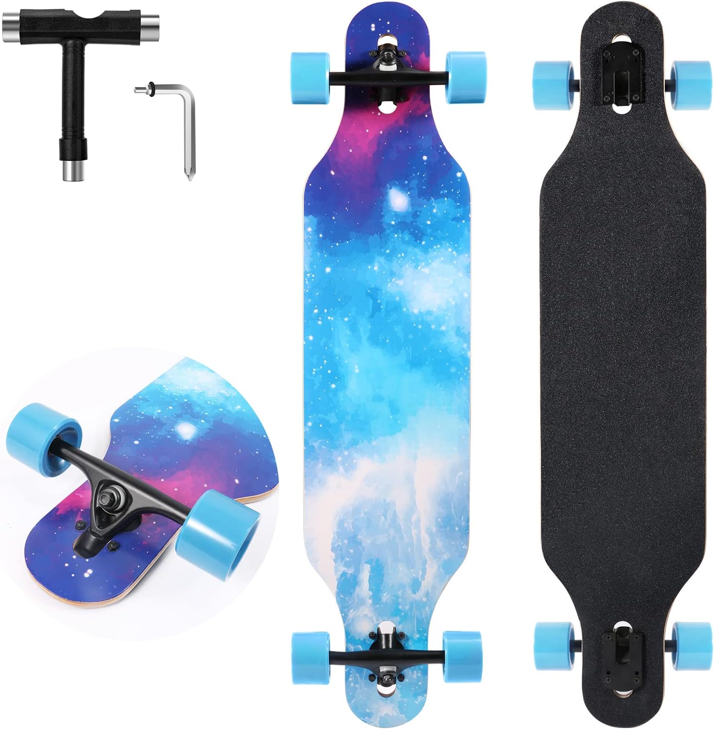 • [VERSATILE BOARD] Designed by passionate longboarders and designers. No assembly required, each long skateboard comes assembled and ready to ride. Longboard skateboard equipped with an all-in-one t-tool, adjust truck stiffness to your riding style in seconds.