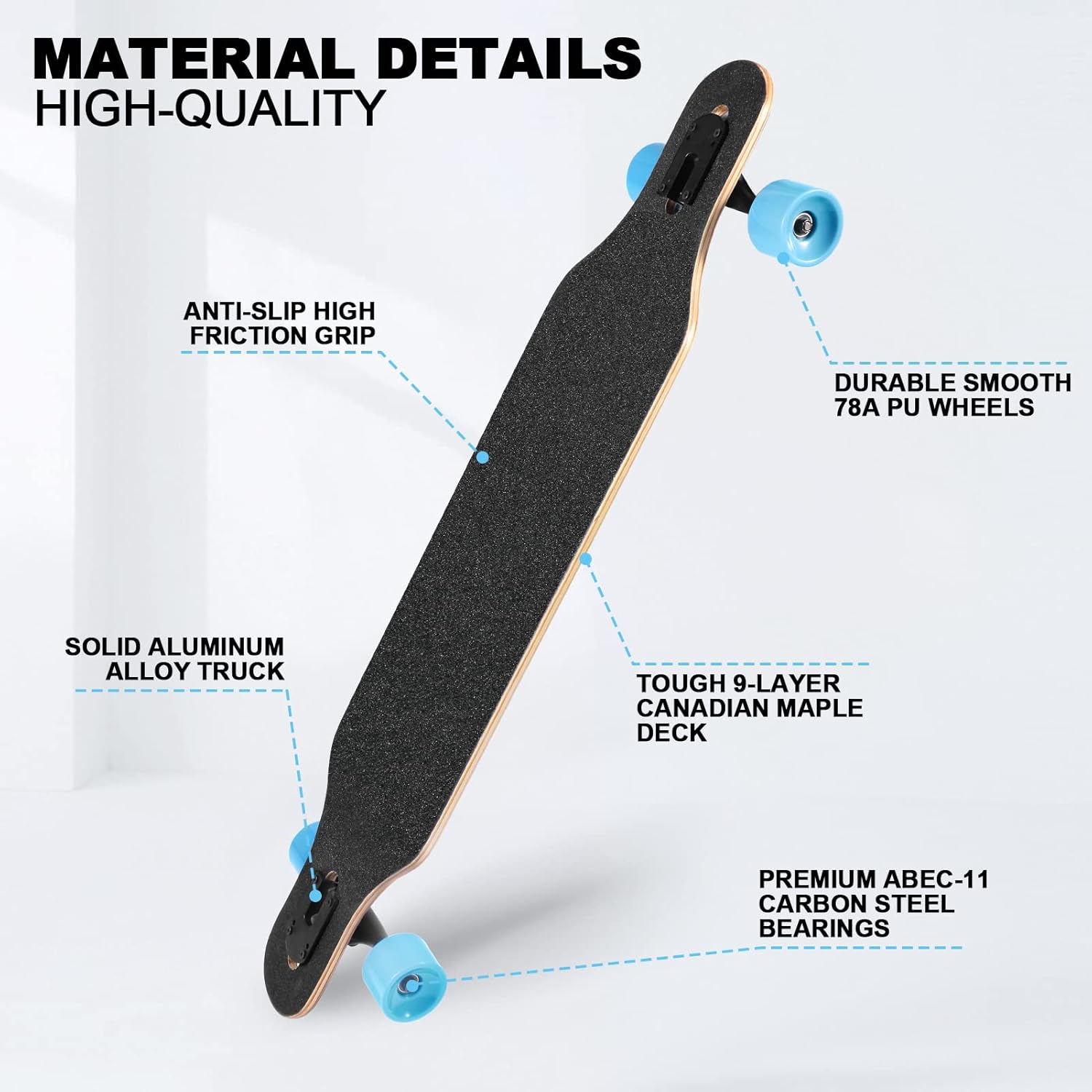 • [TOUGH MAPLE DECK] 41 inch long x 9.5 inch wide deck made of cold press 9-ply natural maple. This is a great long board for teenagers girls, adults, teens and kids. The 9-layer of high-quality maple wood give the board a significant amount of strength without compromising flex. No assembly required.