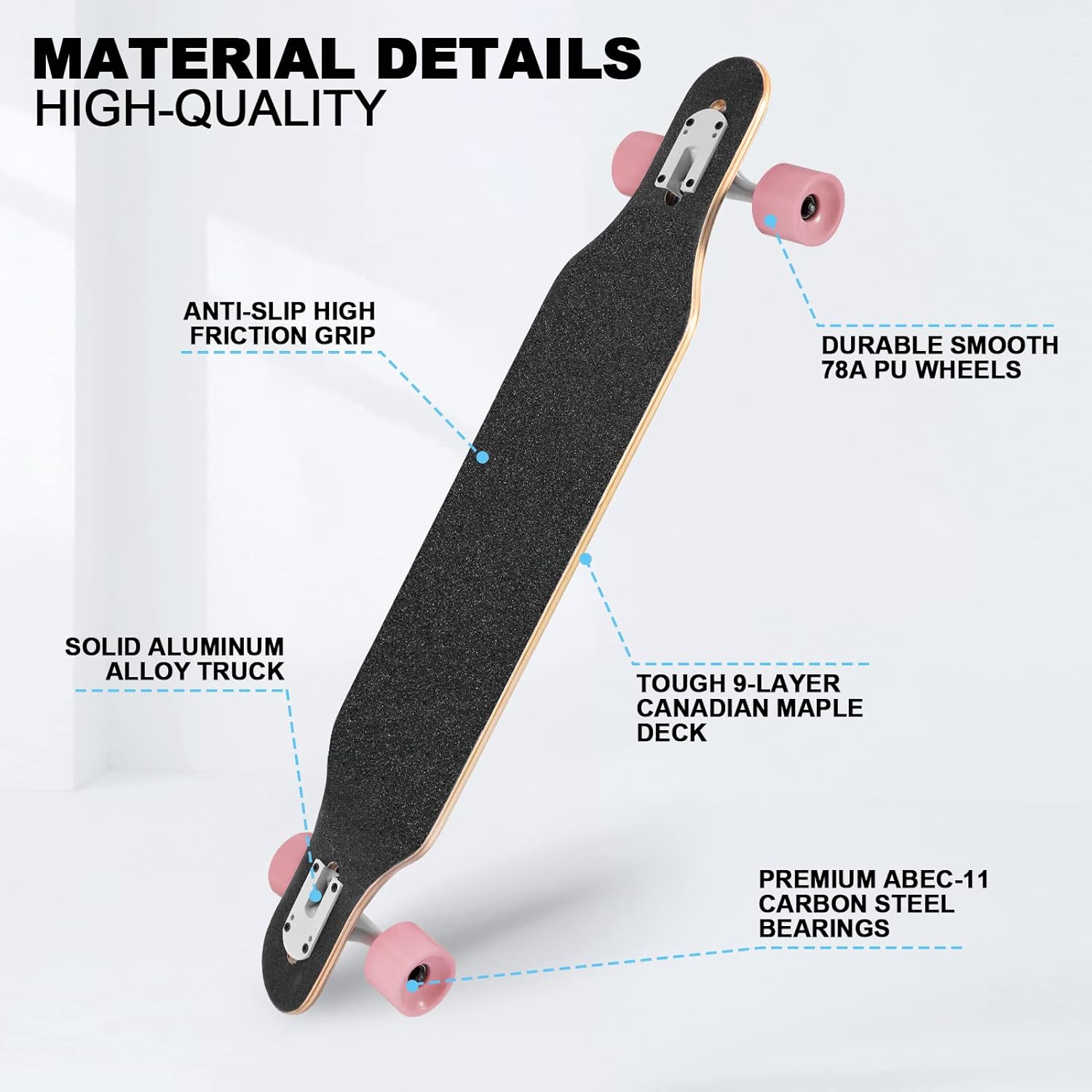 • [TOUGH MAPLE DECK] 41 inch long x 9.5 inch wide deck made of cold press 9-ply natural maple. This is a great long board for teenagers girls, adults, teens and kids. The 9-layer of high-quality maple wood give the board a significant amount of strength without compromising flex. No assembly required.